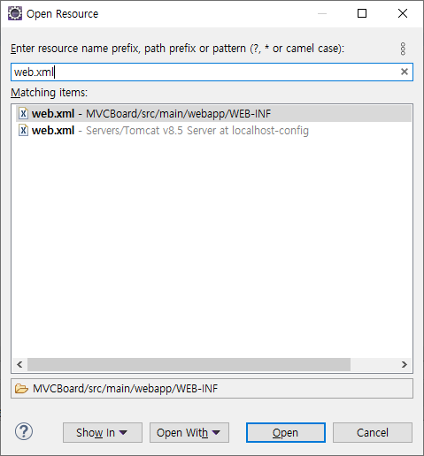 일단, <web.xml> 파일을 찾아가자 (단축키는 'Ctrl + Shift + R', 빠르게 필요한 파일을 찾을 때 유용하다)